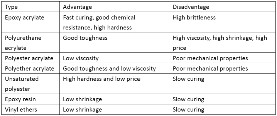 常用預(yù)聚物分為以下幾種類型,它們的性能特點也各不相同。